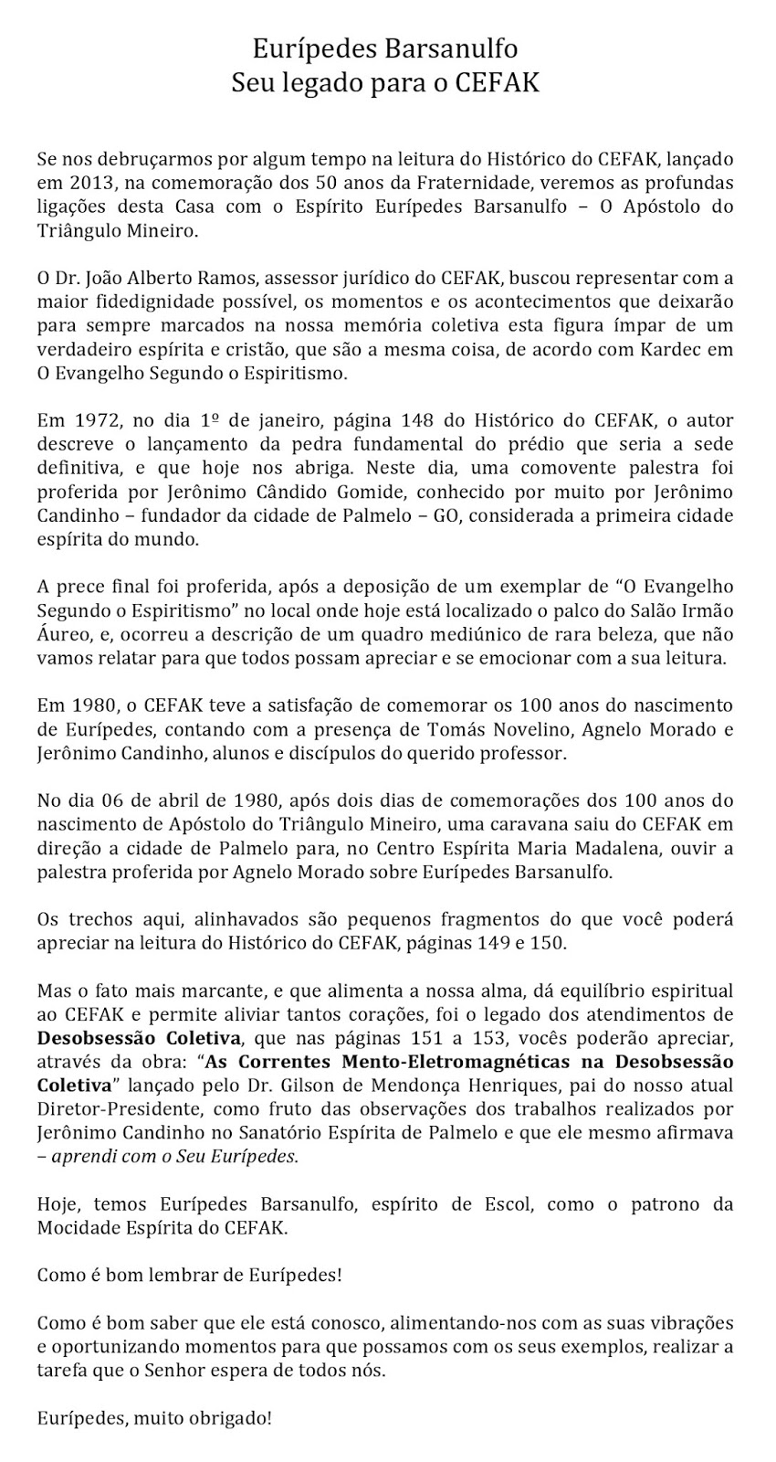 Fazemos nossas as palavras de Jorge Rizzini, na obra Eurípedes Barsanulfo – O Apóstolo da Caridade: